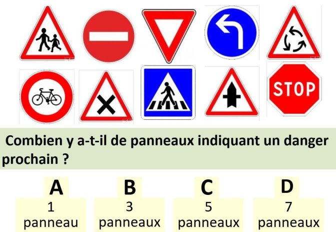 C => 5 panneaux. Tous les panneaux triangulaires bordés de rouge indiquent un danger qu’ils aient la point vers le haut ou la pointe vers le bas. Les panneaux de danger présentés ici sont : "Attention, passage fréquents d’enfants", "Attention, priorité à droite au prochain carrefour", "Attention, balise de priorité" (Cédez le passage), "Attention, route prioritaire au prochain carrefour", "Attention, giratoire".