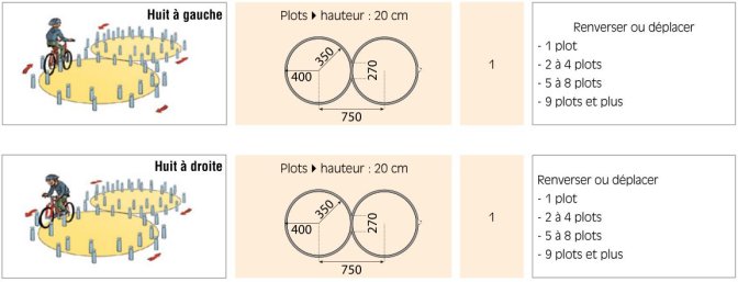 Consignes : "Suivre le couloir pour faire un huit sans poser les pieds au sol et sans faire tomber une quille. Préciser, si exigé, le sens du premier cercle."