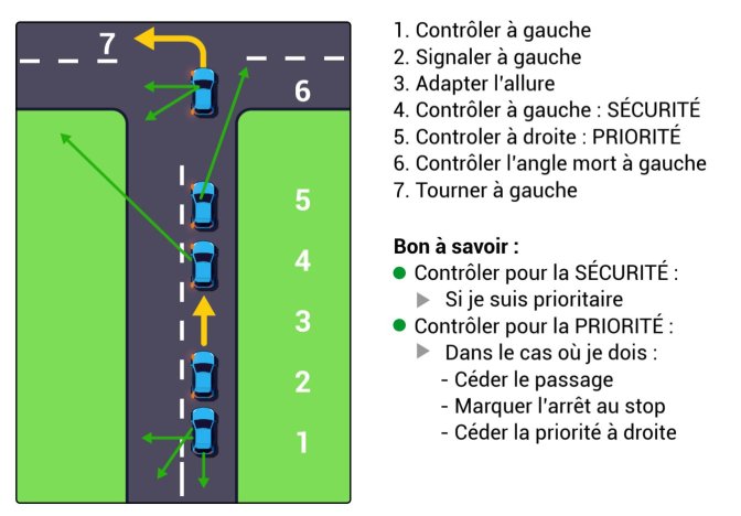 - si aucun véhicule n’arrive en face (priorité), tourner enfin à gauche (s’arrêter évidemment si un véhicule se présente en face).